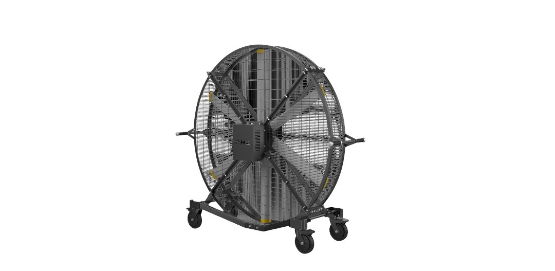 2. Designed for high adaptability, the fan is equipped with four independent swivel wheels and integrated handles, enabling smooth movement through standard doorways, while foot-lock mechanisms ensure stable positioning during operation.