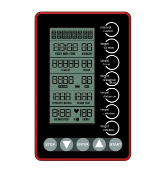 Display Console: Shows time, distance, strokes, SPM, calories, watts, and heart rate