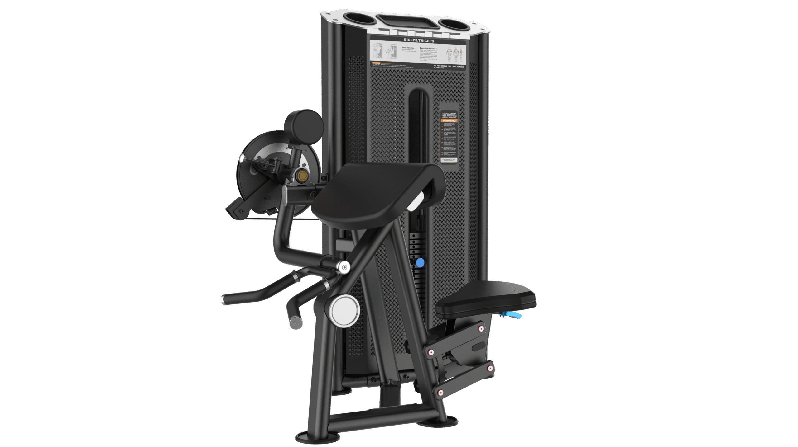 Dual-purpose design allows both biceps curl and triceps extension on one machine.